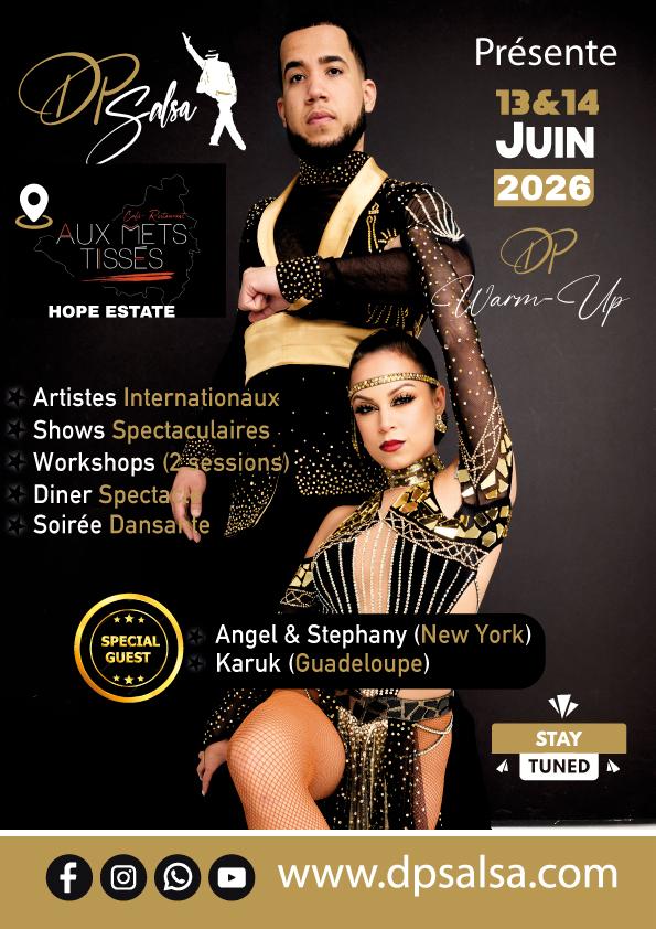On June 13 and 14, 2026, the DPSF WARM-UP promises once again to be spectacular. For one weekend, immerse yourself in the captivating world of salsa with Angel & Stephany, two international artists from New York, as well as Karuk from Guadeloupe, a dancer known and recognized on the international scene, who will set the dance floors on fire.